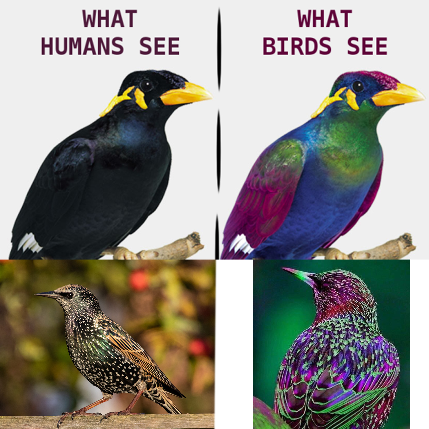 Z kolei ptaki widzą dodatkowo zakres UV, dzięki czemu ich świat jest bardziej kolorowy. Z naszego polskiego podwórka świetnym przykładem może być szpak. Dla nas wydaje się być czarny w białe plamki, jedynie czasem w promieniach słońca można zobaczyć delikatne połyskujące tęczowe kolory. Z kolei inne ptaki widzą w nim trochę więcej barw niż my- symulacja poniżej. Podobnie jest z jajkami ptaków- okazuje się, że niektóre z nich posiadają niewidoczne dla nas wzory. Innymi zwierzętami, które widzą w spektrum UV są niektóre gatunki ośmiornic. Nawet wykorzystują one to do komunikacji (potrafią zmieniać kolory). Warto wspomnieć, że na szczęście ludzie nauczyli się w pewien sposób "widzieć" większe spektrum. Przykładem mogą być kamera termowizyjna, albo zdjęcia rentgenowskie.